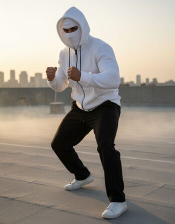 Plongez dans le confort ultime avec cet ensemble capuche cagoule zippé blanc, idéal pour un look anonyme et tendance, associé à un jogging baggy noir doux. Parfait pour les rues de Tunisie, chaud et stylé!
