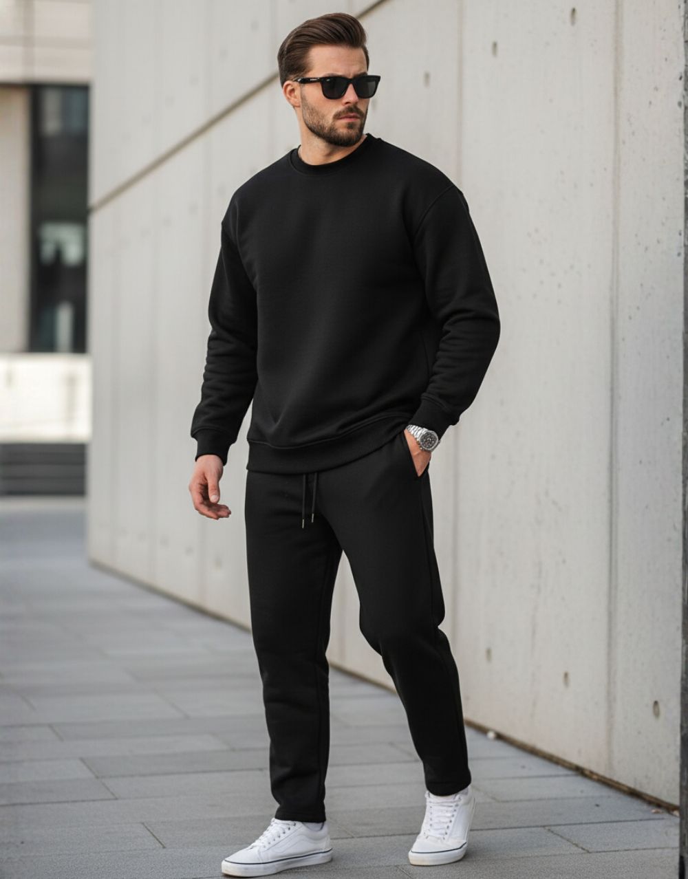 Ensemble survêtement minimaliste composé d’un sweat à capuche et d’un pantalon assorti, disponible en plusieurs coloris classiques.