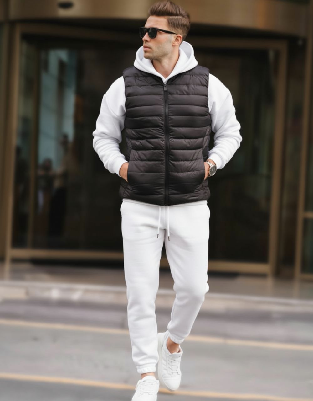 Ensemble streetwear élégant et confortable. Parfait pour les amateurs de mode urbaine, cet ensemble en noir classique comprend un gilet matelassé léger + un sweat à capuche moderne + un pantalon jogging. Idéal pour un look casual ou sportif, tout en restant tendance et pratique.