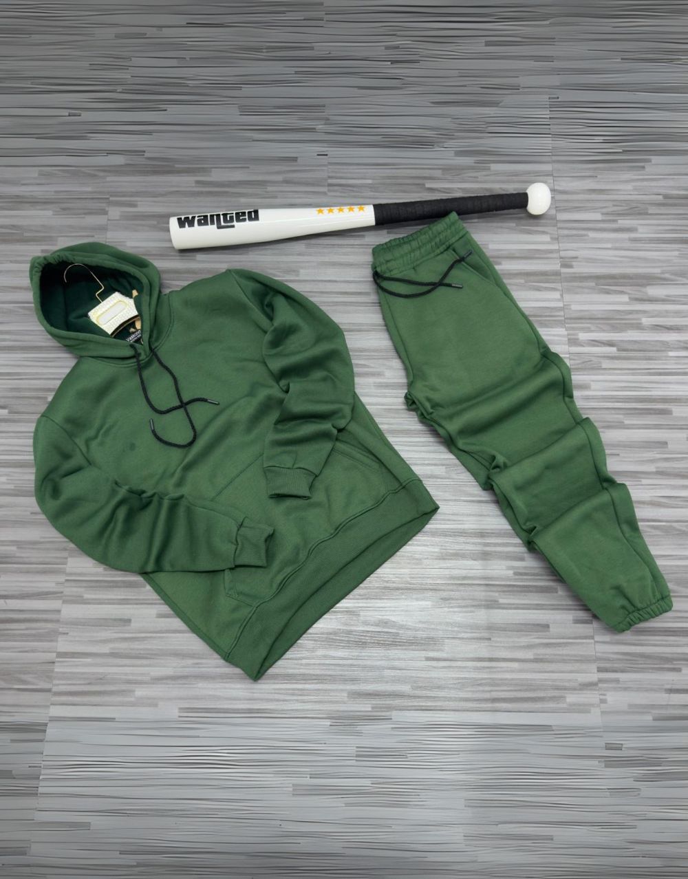 Ensemble survêtement minimaliste composé d’un sweat à capuche et d’un pantalon assorti, disponible en plusieurs coloris classiques.