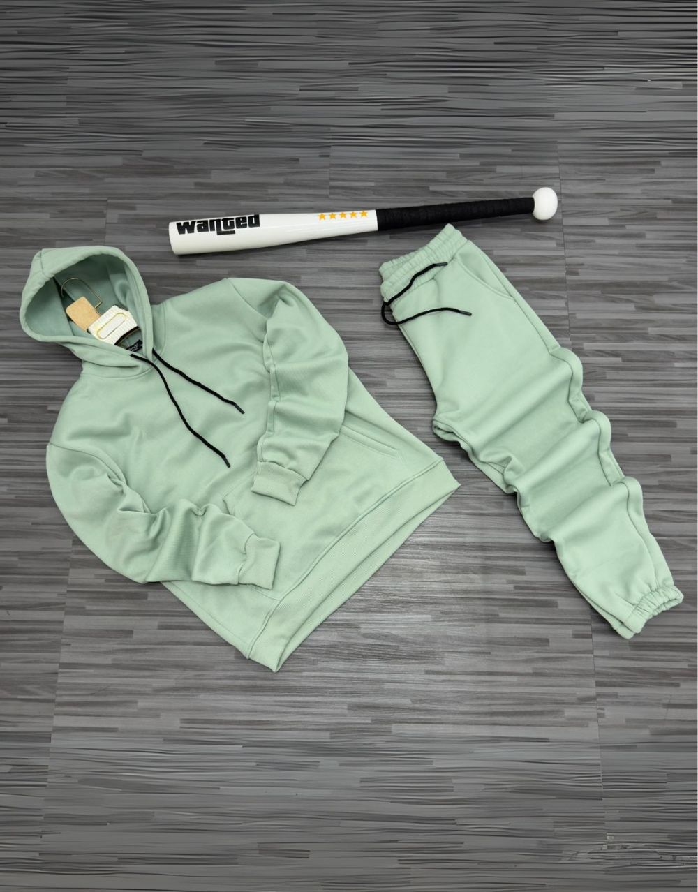 Ensemble survêtement minimaliste composé d’un sweat à capuche et d’un pantalon assorti, disponible en plusieurs coloris classiques.